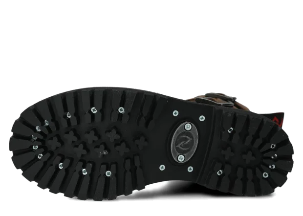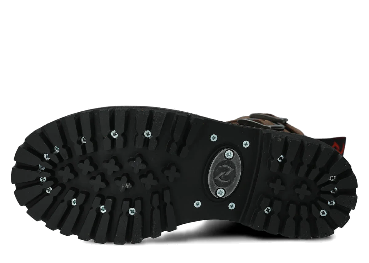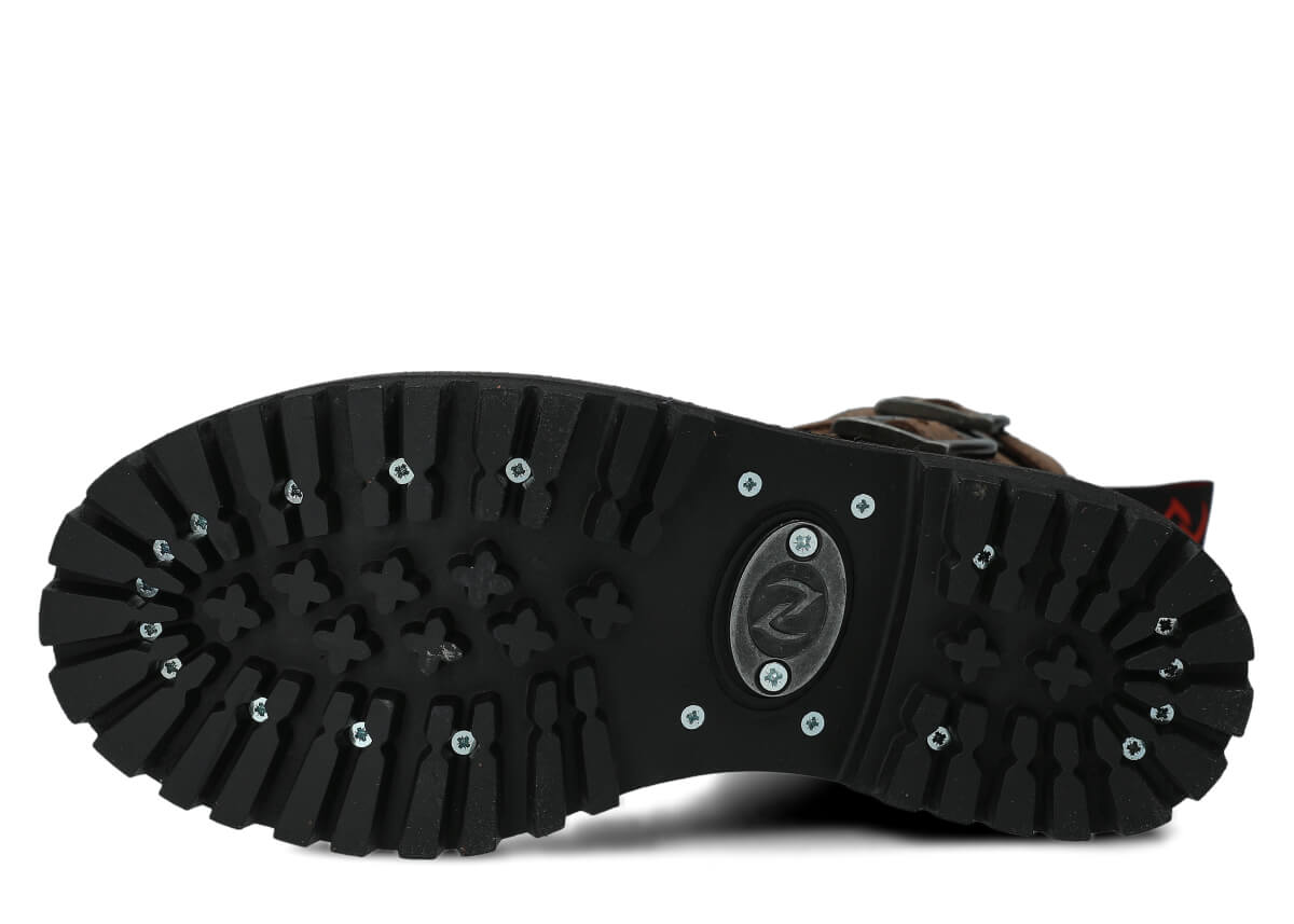 Antypoślizgowa podeszwa z prawdziwej gumy jest ozdobiona dekoracyjnymi śrubami i charakterystycznym metalowym logo, co nadaje butom niepowtarzalny charakter.