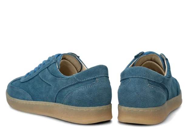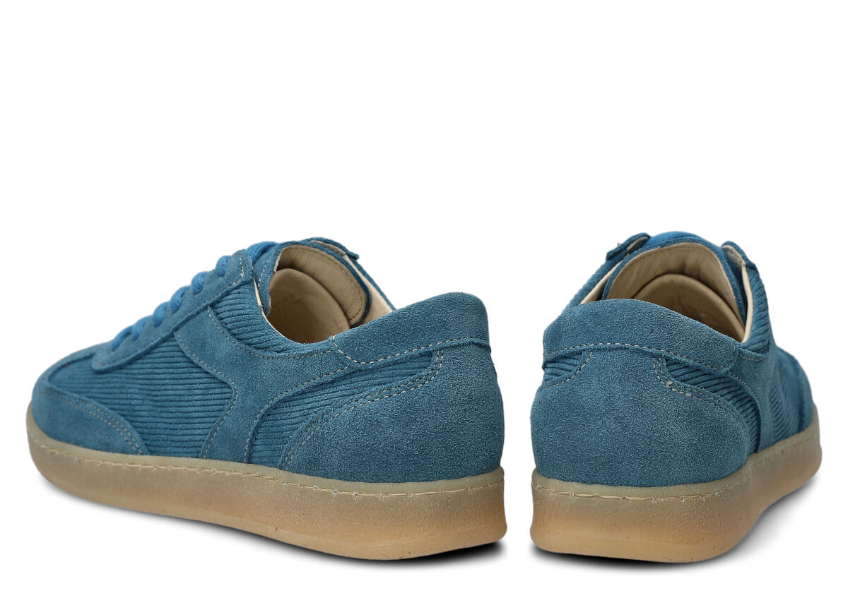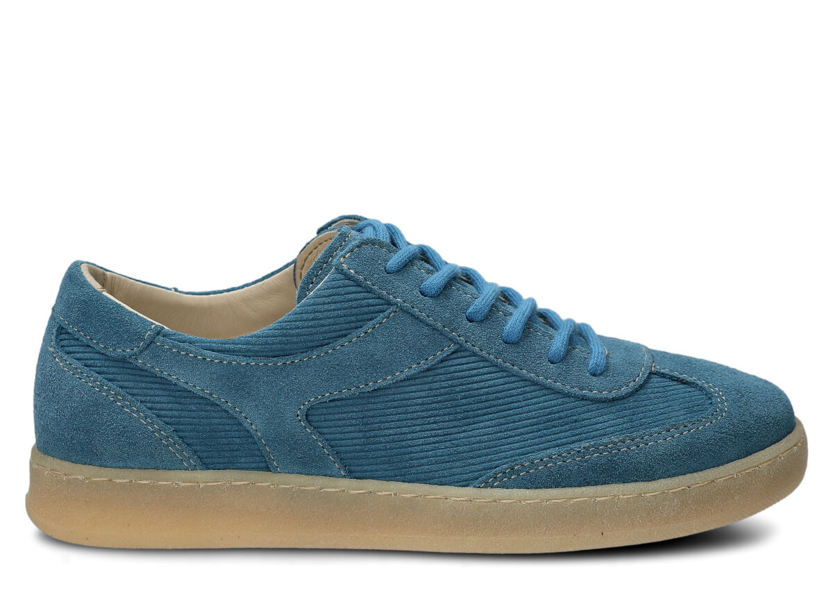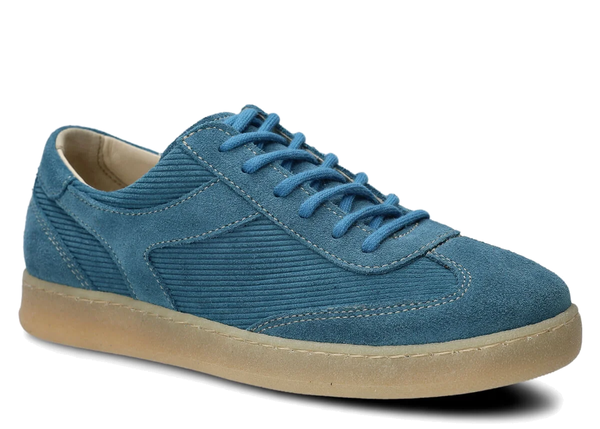 Półbuty damskie skórzane Nagaba 130 jeans welur to model, który przenosi klasykę mody w nowoczesny kontekst – idealny dla młodych kobiet i nastolatek szukających wygodnych butów z charakterem. Cholewka uszyta z połączenia naturalnej skóry welurowej w jednolitym jeansie, wzbogacona skórą naturalną welurową z prążkowanym deseniem sztruksu, budzi skojarzenia z vintage trendami z lat 70. i 80., dodając stylizacjom unikalnego, kulturowego vibe'u. Ręcznie wykonane w Polsce z wyselekcjonowanych materiałów, te półbuty młodzieżowe łączą miękkość weluru z praktycznością na miejskie ulice.