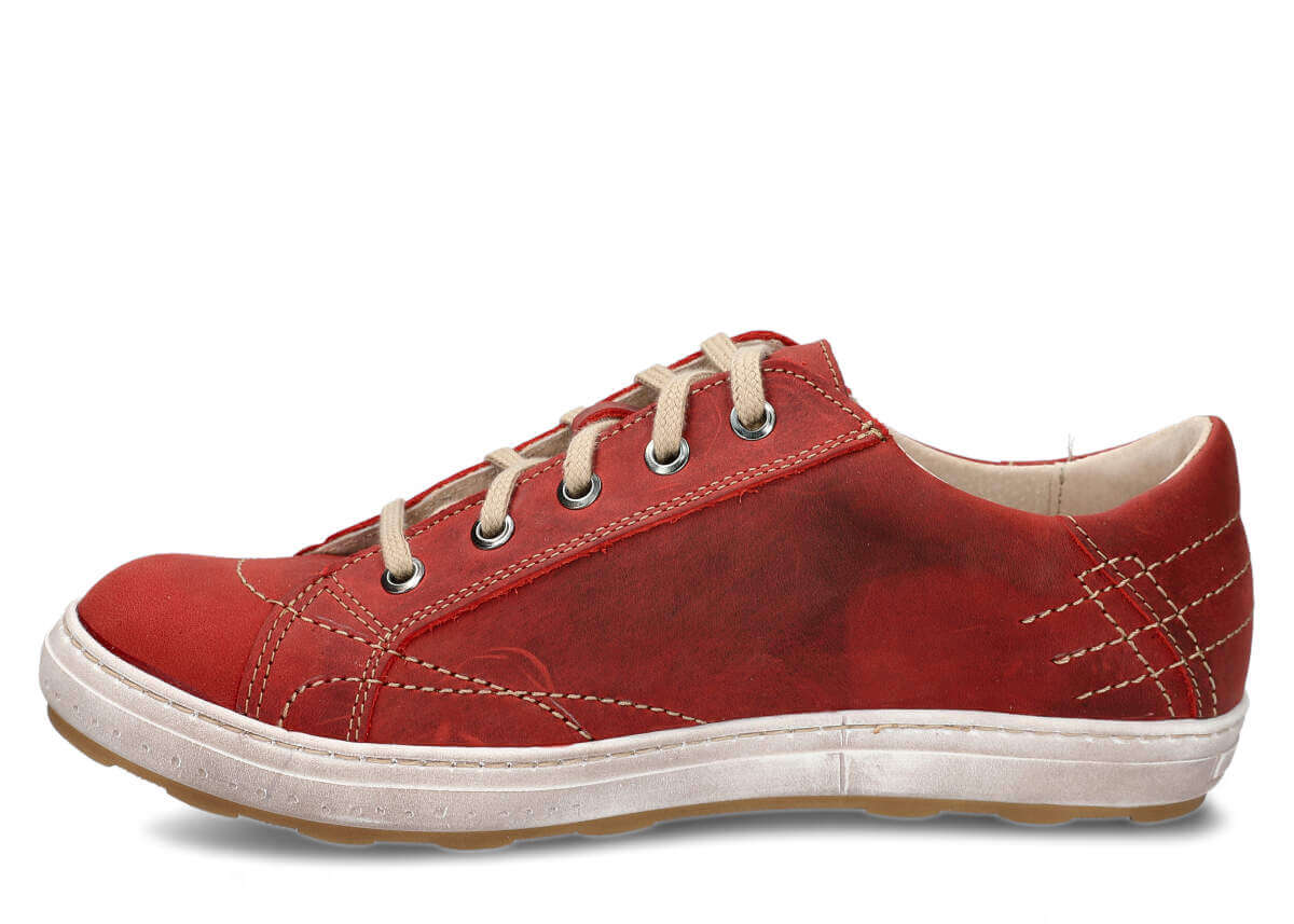 które zostało wykonane w kolorze czerwonym. W całości buty te zostały stworzone ze skóry, a ich lekkość sprawdzi się przede wszystkim podczas wybierania luźnych, nieformalnych stylizacji.