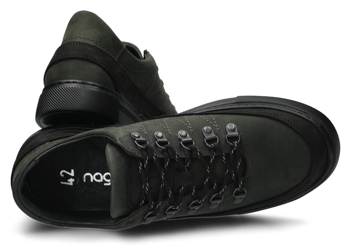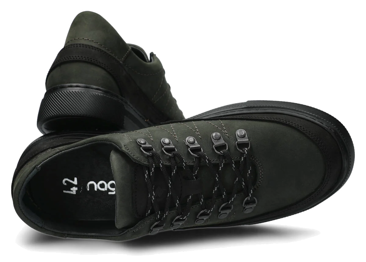 Ten niezwykle interesujący model – półbuty męskie NAGABA 463 khaki crazy skórzane - są wyjątkowe z kilku powodów. Zastosowanie w nich skóry naturalnej jako podszewki oraz w wyściółce wraz ze sprężystą pianką, a na cholewce w formie naturalnej skóry licowej typu crazy sprawia, że są to buty niezwykle wytrzymałe, o solidnej konstrukcji. Ich funkcjonalność, w tym zapobieganie poceniu się, pozwalają na pokonywanie w nich wielu kilometrów podczas pieszych wędrówek czy wakacyjnego zwiedzania. Jednak ich niebanalny wygląd zachęca do wkładania ich również do codziennych stylizacji – do szkoły, pracy lub na spotkania z przyjaciółmi. Można zestawiać je dowolnie z jeansami, szortami czy odzieżą typowo turystyczną.