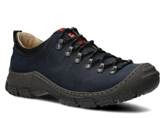Czarne półbuty trekkingowe męskie skórzane 444 z niską cholewką zostały wykonane z wysokiej jakości skóry pochodzenia naturalnego typu Crazy, dzięki czemu przy zachowaniu odpowiedniej pielęgnacji będą służyć Ci przez długi czas, zapewniając wysoki komfort użytkowania. Jednak co najważniejsze, prezentowany przez nas półbut trekkingowy męski skórzany 444 w kolorze klasycznej czerni został zaprojektowany w taki sposób, aby spełniać najwyższe wymagania naszych Klientów. Z tego względu zadbaliśmy o innowacyjną podeszwę wzorowaną na męskim modelu 055. Odpowiednio ukształtowana z pogrubionym bieżnikiem nie tylko zapewnia wysoką wygodę noszenia, ale przede wszystkim wyróżnia się podwyższoną wytrzymałością. Ponadto obuwie jest wzbogacone o dodatki, tj. metalową galanterię w postaci uchwytów dodających modnego charakteru, interesujące przeszycia na cholewce, a na szlufce, kołnierzu i pięcie obuwia - ciekawy akcent w postaci czarnej skóry naturalnej.