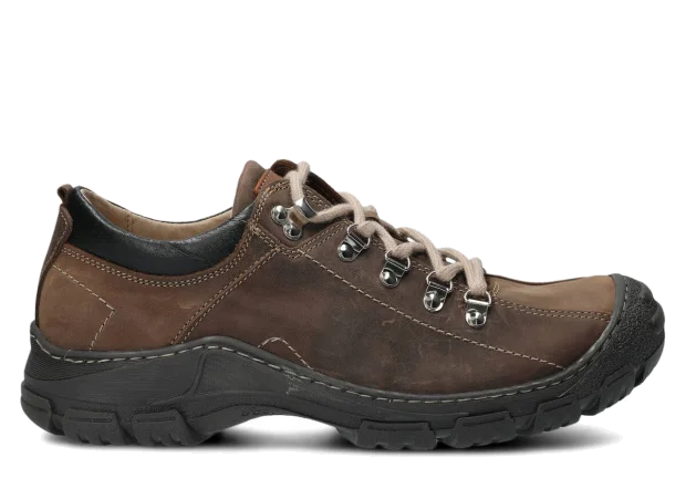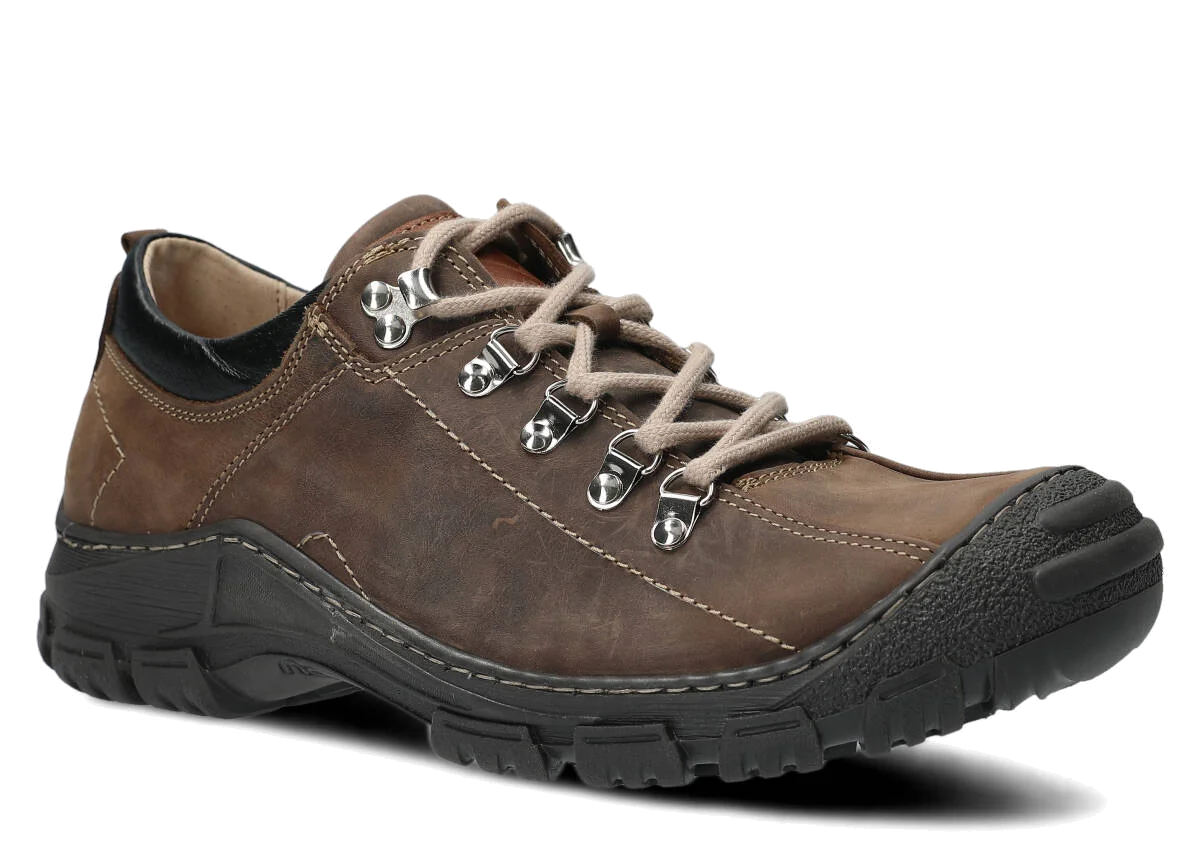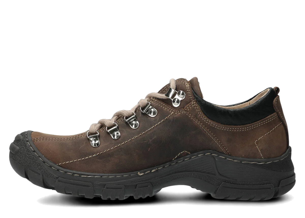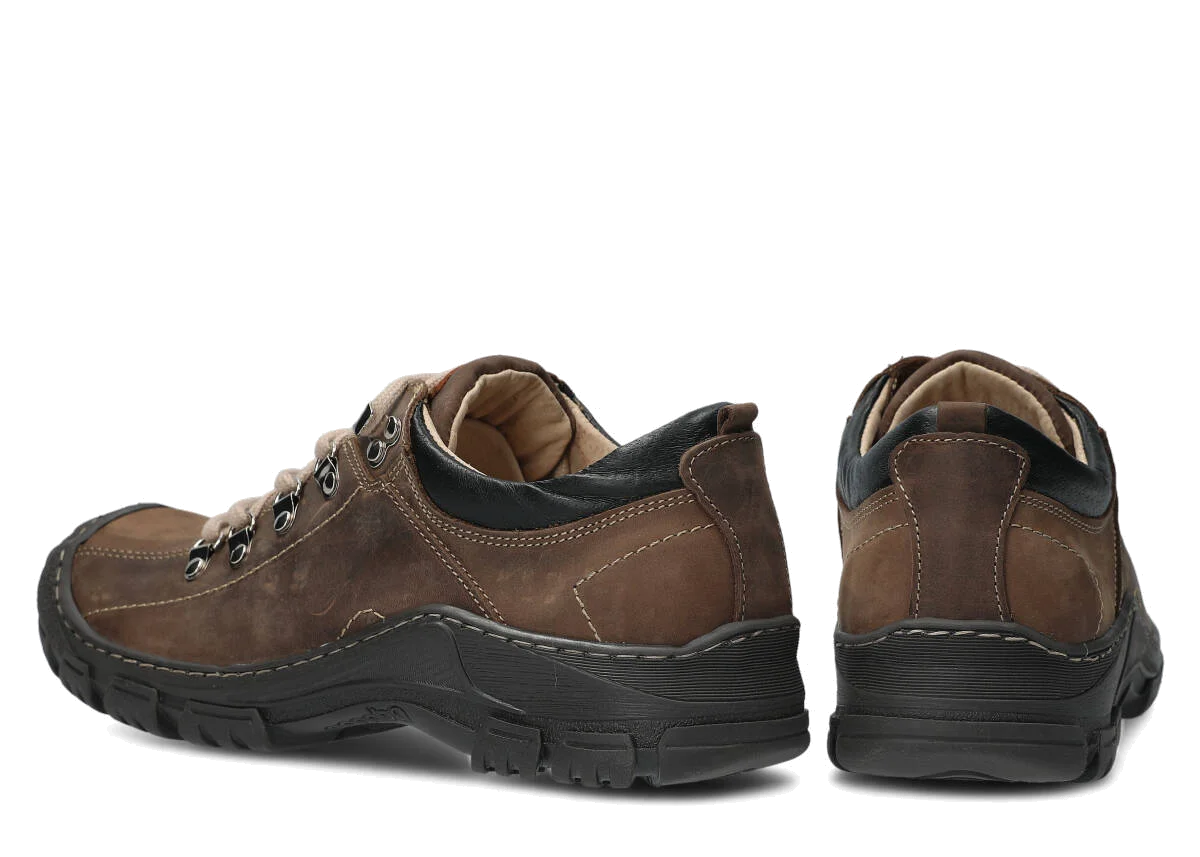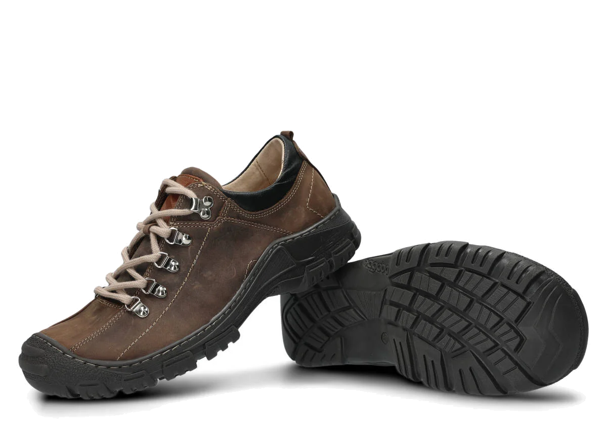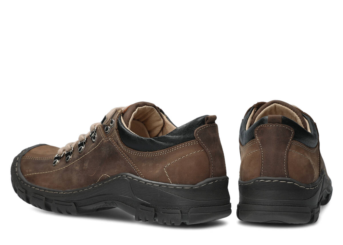 Dodatkowym atutem oliwkowych półbutów trekkingowych męskich skórzanych 455, który jest zarazem dowodem na to, że praktyczność oraz styl idą w parze, jest innowacyjna podeszwa. Stworzona z myślą o podwyższeniu komfortu użytkowania i podniesieniu poziomu bezpieczeństwa wyróżnia się specyficznym kształtem oraz uniesionymi brzegami odpowiedzialnymi za stabilizację części piętowej. Niemałą rolę odgrywa również pogrubiony bieżnik, który zwiększa wytrzymałość podeszwy na niekorzystne działanie czynników zewnętrznych.