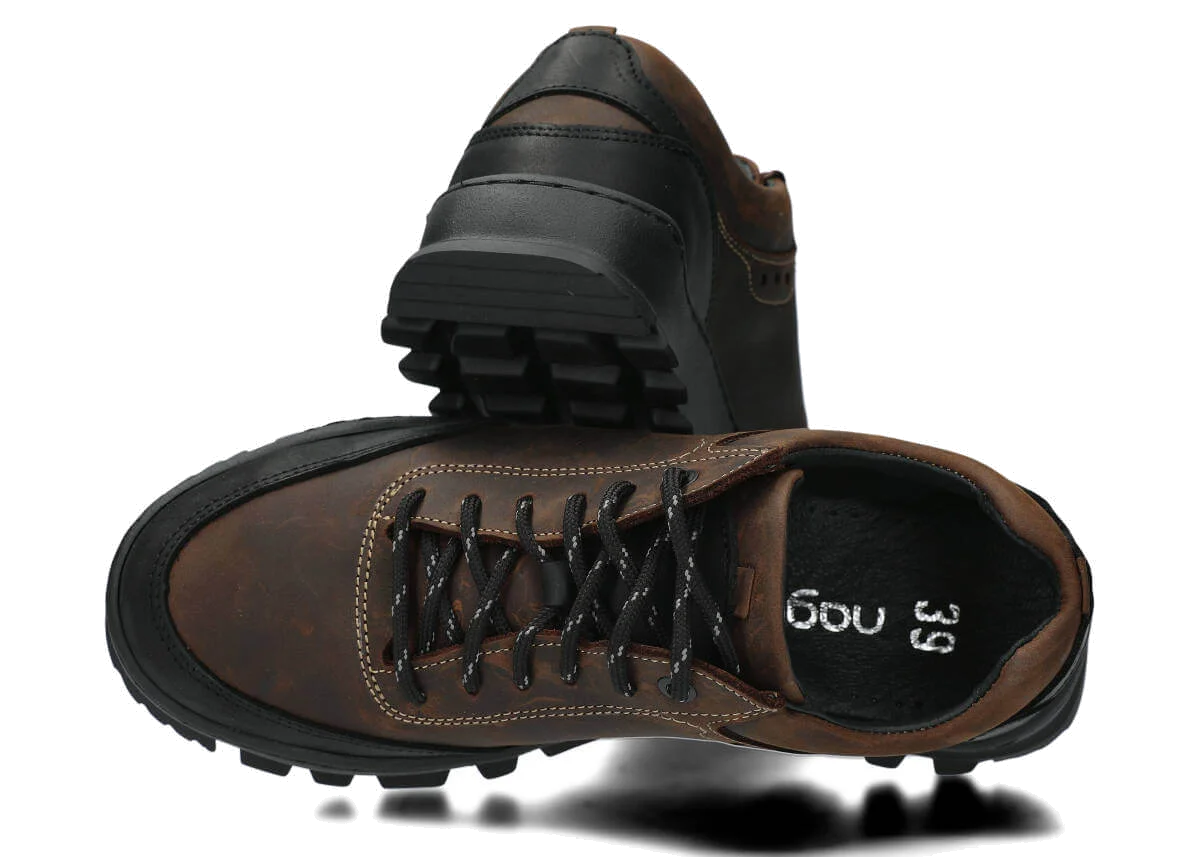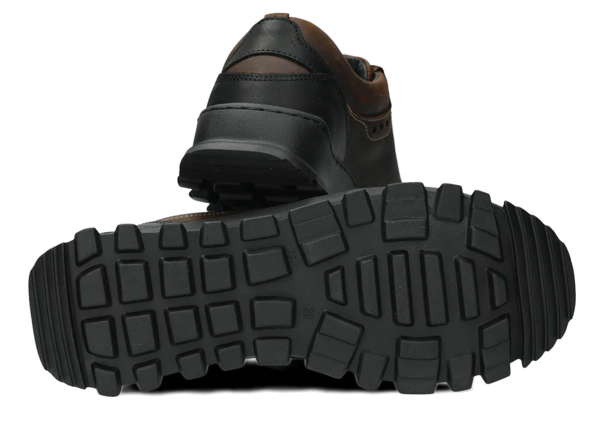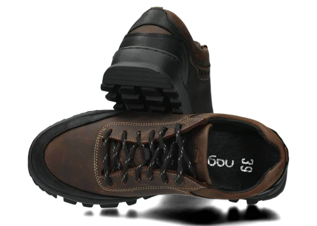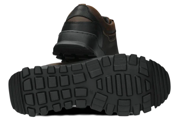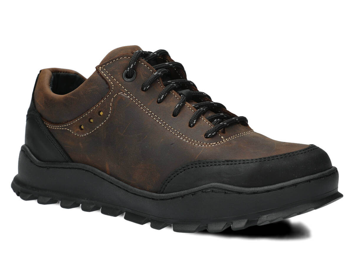 Prezentowane przez nas półbuty trekkingowe skórzane 0521 w kolorze oliwka zostały wykonane z solidnych komponentów z Polski oraz zagranicy. Są to: ciemna podeszwa, ciemny element materiału na czubku i tylniku buta, a także kolorowa skóra naturalna typu Crazy (jako materiał wierzchni, podszewka oraz wyściółka obuwia). Za jej sprawą idealnie dopasowuje się do kształtu stopy, zapewnia odpowiednie właściwości higieniczne i przekłada się na podwyższone poczucie komfortu. Miłośnikom pieszych wycieczek z pewnością spodoba się dodatkowy atut, jakim jest traperowaty charakter bieżnika zapewniający dobrą przyczepność do różnych terenów.