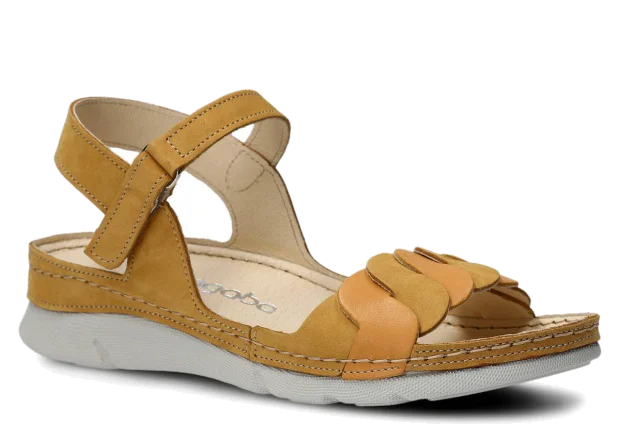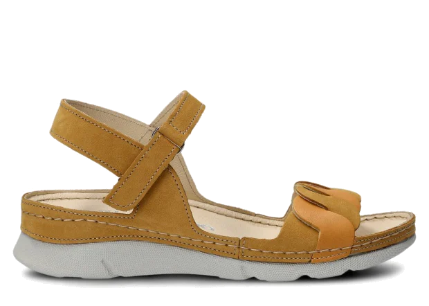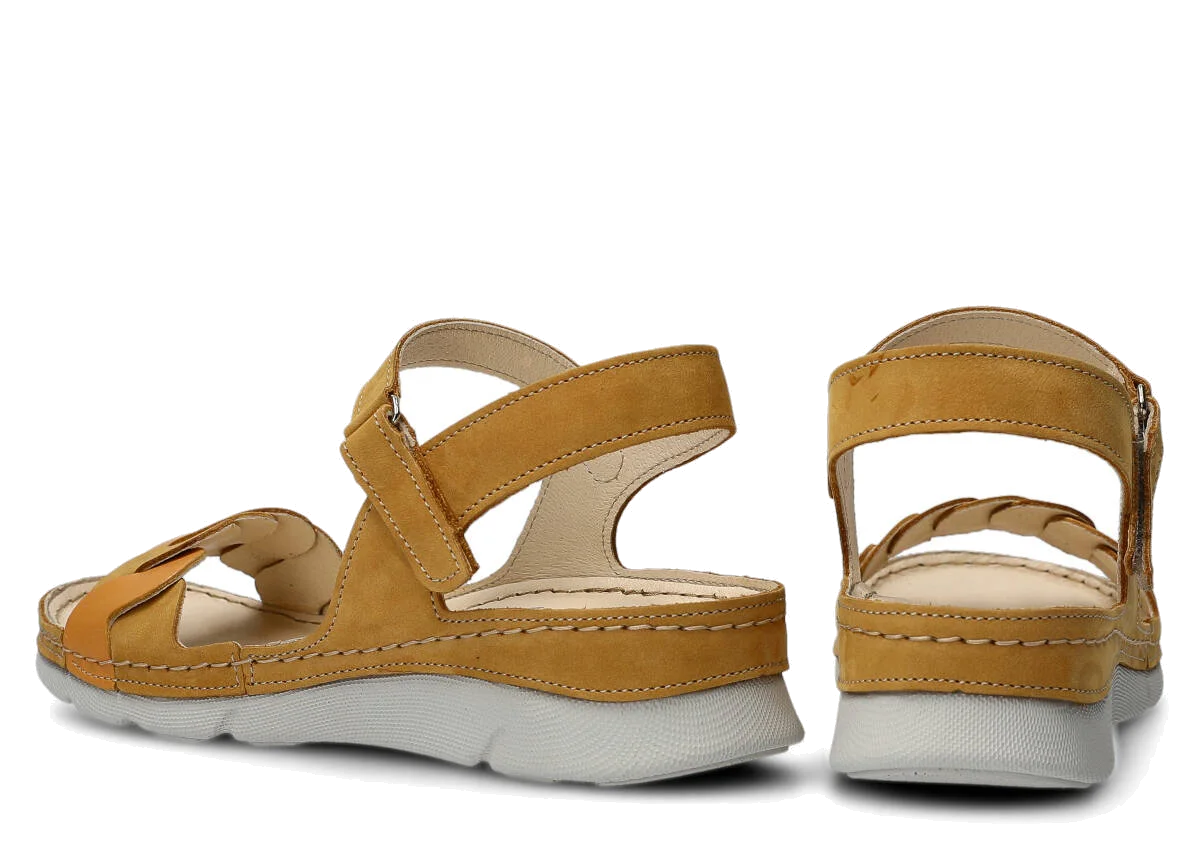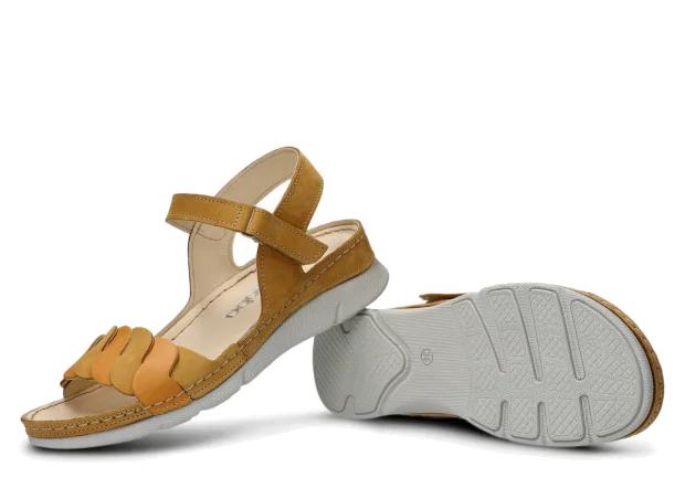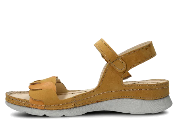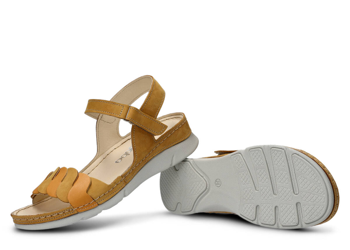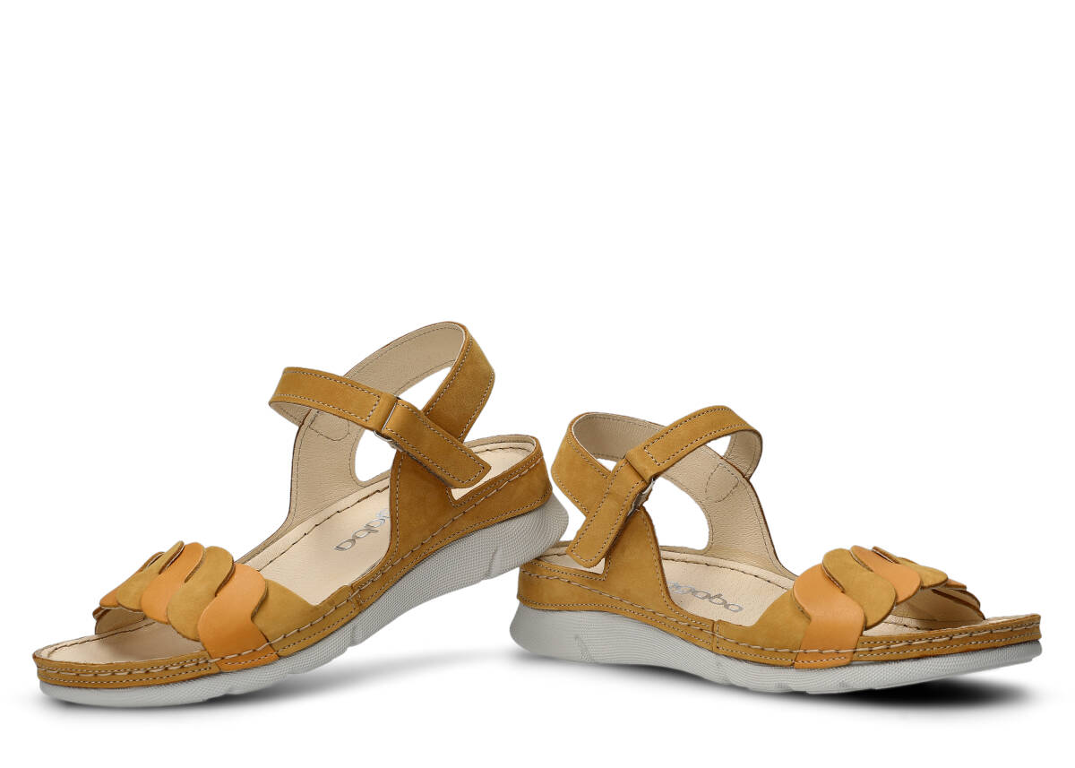 Na letnią, upalną pogodę doskonale nadają się żółte sandały Nagaba 101, do których stworzenia została wykorzystana skóra samuel.