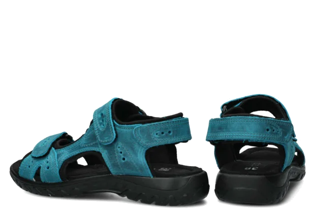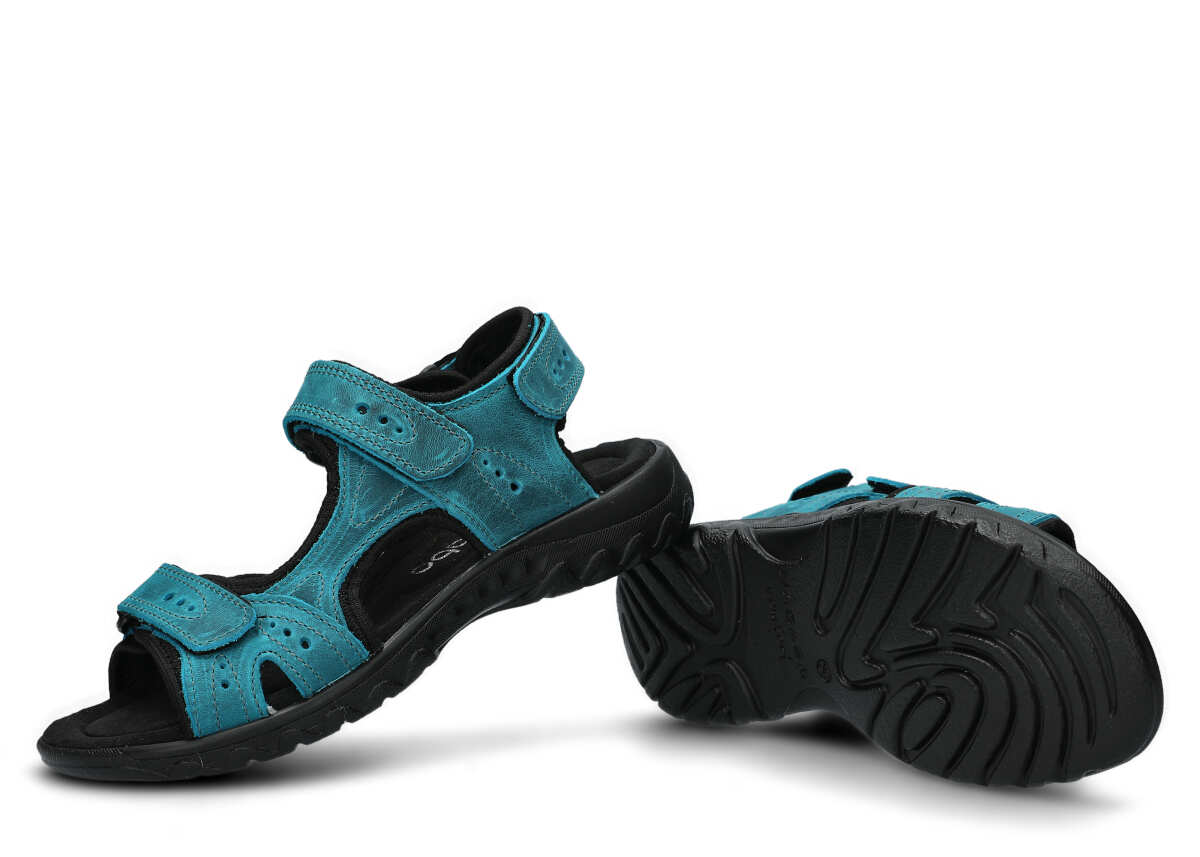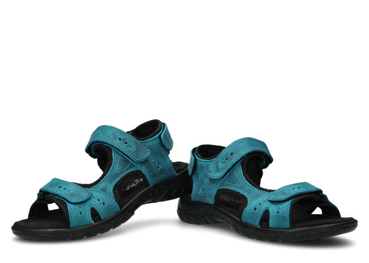 Zastosowany podczas szycia materiał tj. skóra naturalna pochodzi od cenionych i godnych zaufania firm. To właśnie dzięki niemu sandały damskie Nagaba 264 turkus crazy skórzany są nie tylko bardzo ładne, ale przede wszystkim odznaczają się wysoką funkcjonalnością. Skóra naturalna to materiał antyalergiczny, pozbawiony szkodliwych chemikaliów, co sprawia, że obuwie jest całkowicie bezpieczne dla zdrowia stóp. Równocześnie sandały damskie Nagaba 264 turkus crazy skórzany nie przyczynią się do powstania otarć, odcisków oraz podrażnień. Prezentowane sandały Nagaba szybko i wygodnie zapina się na trzy paski na rzepy - umożliwiają one perfekcyjne dopasowanie do stopy. Wyprofilowana i komfortowa podeszwa w czarnym kolorze, która wykonana została z poliuretanu, gwarantuje lekkość oraz elastyczność podczas chodzenia.
