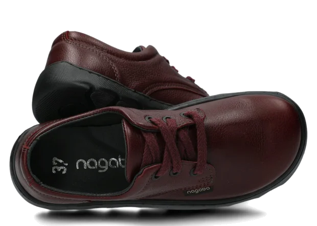 Bordowa cholewka półbuta damskiego Nagaba 630 wykonana jest z miękkiej skóry naturalnej nubuk, któa dopasowuje się do kształtu stopy, zapewniając komfort i higienę. Skórzana podszewka gwarantuje odpowiednią cyrkulację powietrza, dbając o właściwe środowisko dla stóp. Elastyczne elementy usztywniające, takie jak podnosek i zakładka (okala piętowa), wykonane z miękkiego materiału termoplastycznego, zapewniają stabilność i idealne dopasowanie, jednocześnie nie ograniczając naturalnych ruchów stóp.