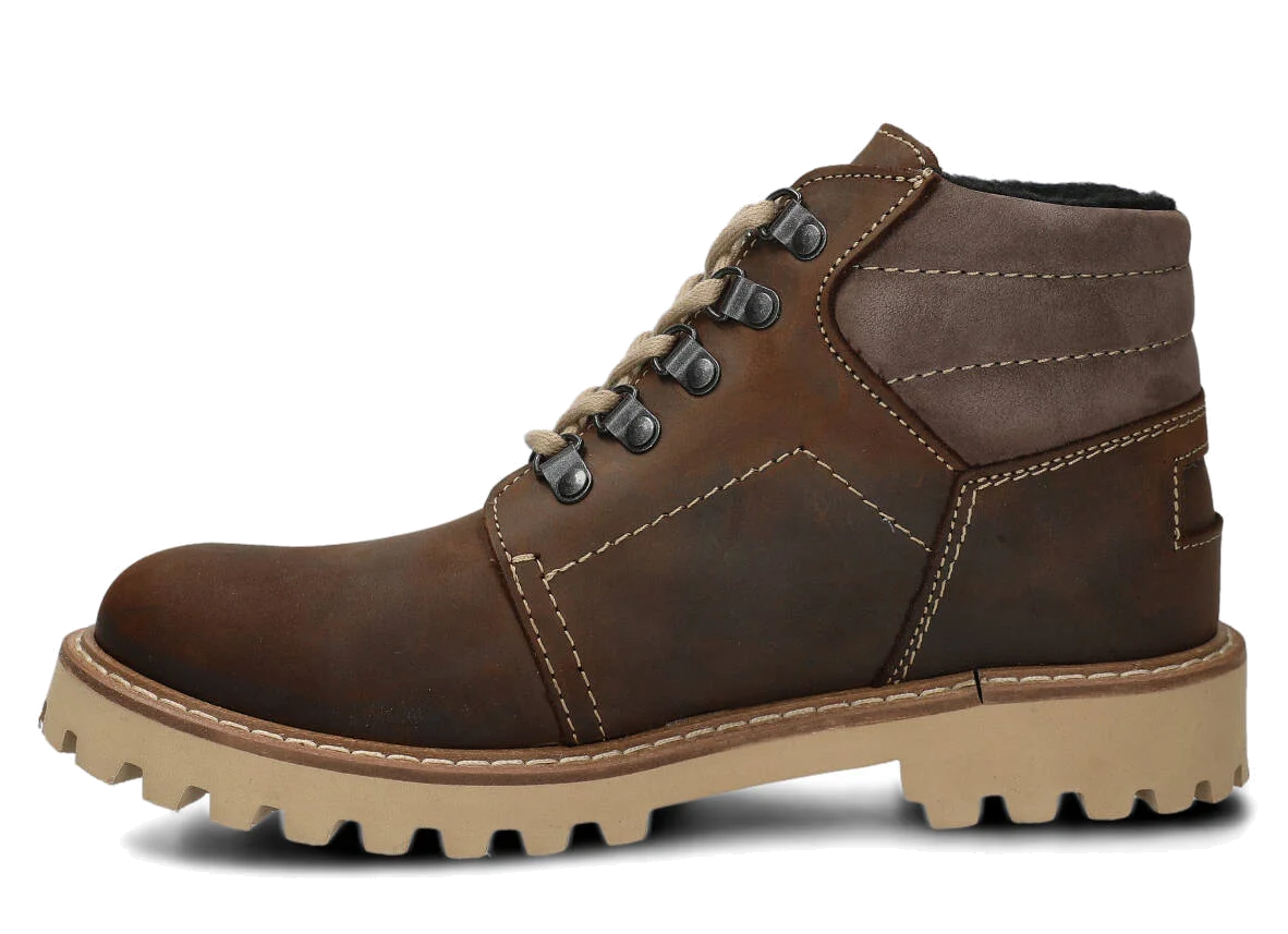 Efekt ten jest rezultatem przede wszystkim zastosowania skóry naturalnej typu crazy, a także super lekkiej podeszwy EVA ze śladem traperka.