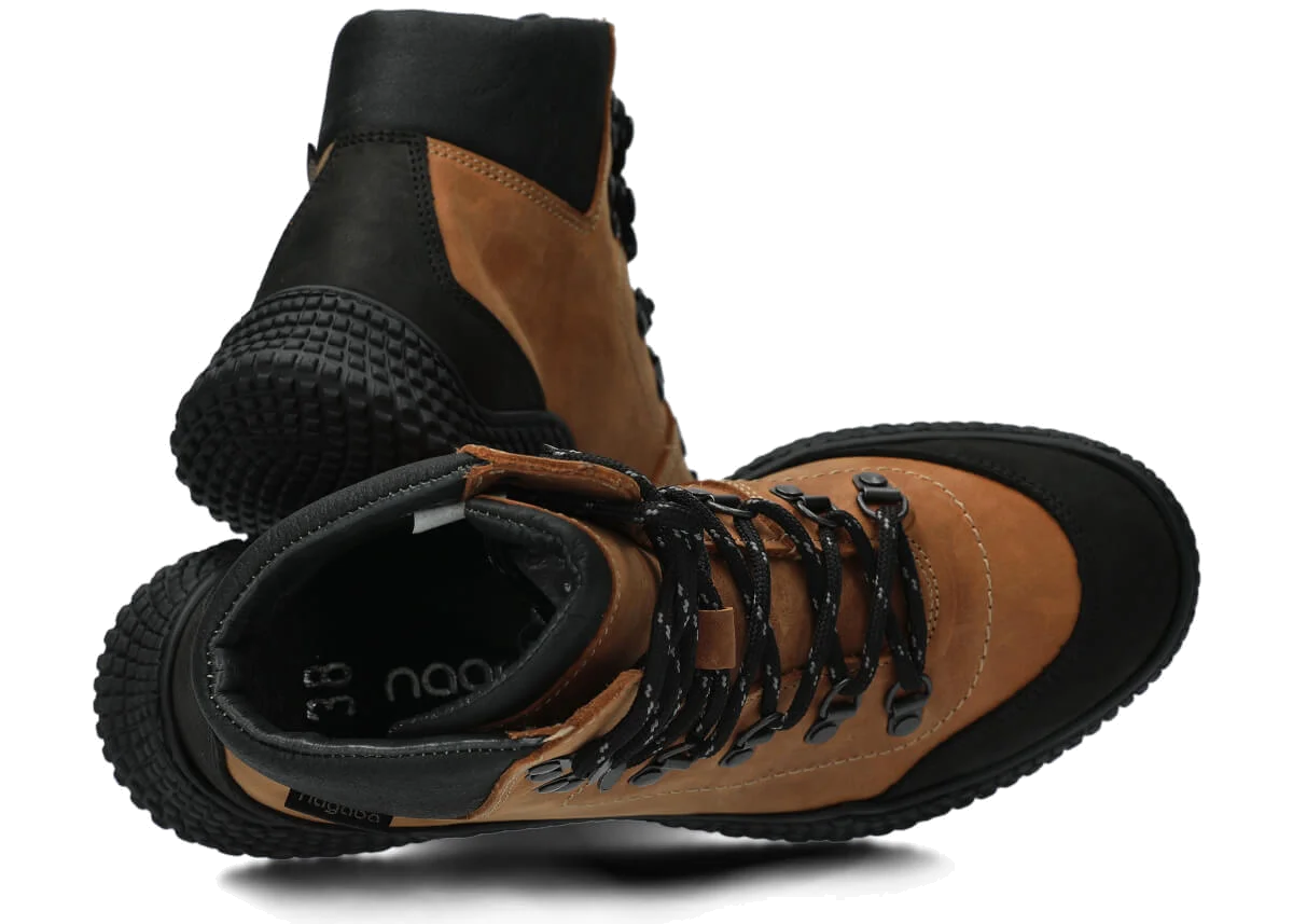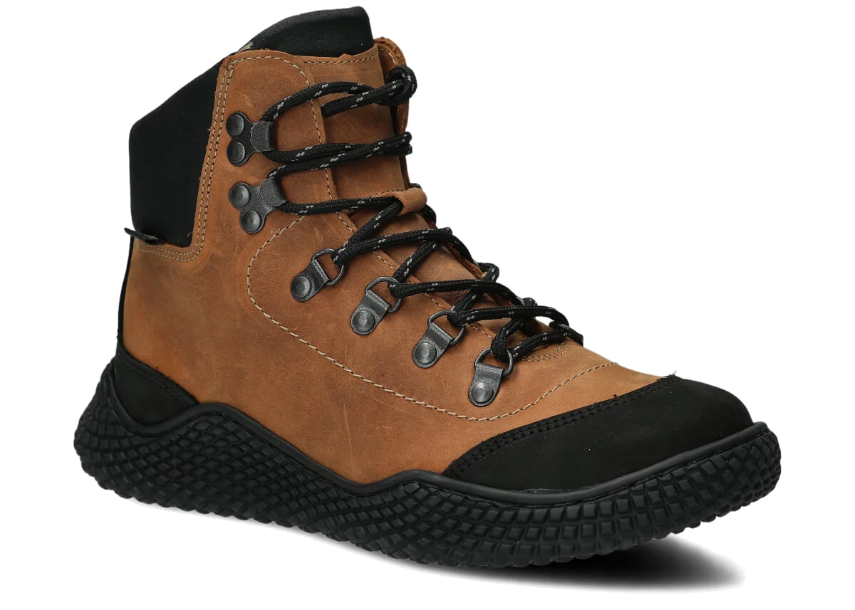 Cholewka składająca się z kombinacji dwóch skór crazy, dominująca brązowa skóra naturalna typu crazy w połączeniu z czarnymi wstawkami na nosku, tylniku i kołnierzu tworzy bardzo charakterystyczny, miejsko-outdoorowy wygląd. Gruba, mięsista, olejowana skóra z naturalnymi plamami, przetarciami i zarysowaniami – każda para jest trochę inna, co daje poczucie unikalności.