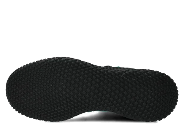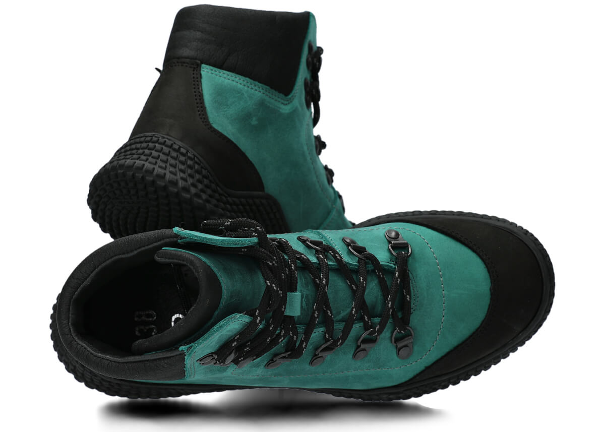 Cholewka składająca się z kombinacji dwóch skór crazy, dominująca szmaragdowa skóra naturalna typu crazy w połączeniu z czarnymi wstawkami na nosku, tylniku i kołnierzu tworzy bardzo charakterystyczny, miejsko-outdoorowy wygląd. Gruba, mięsista, olejowana skóra z naturalnymi plamami, przetarciami i zarysowaniami – każda para jest trochę inna, co daje poczucie unikalności.