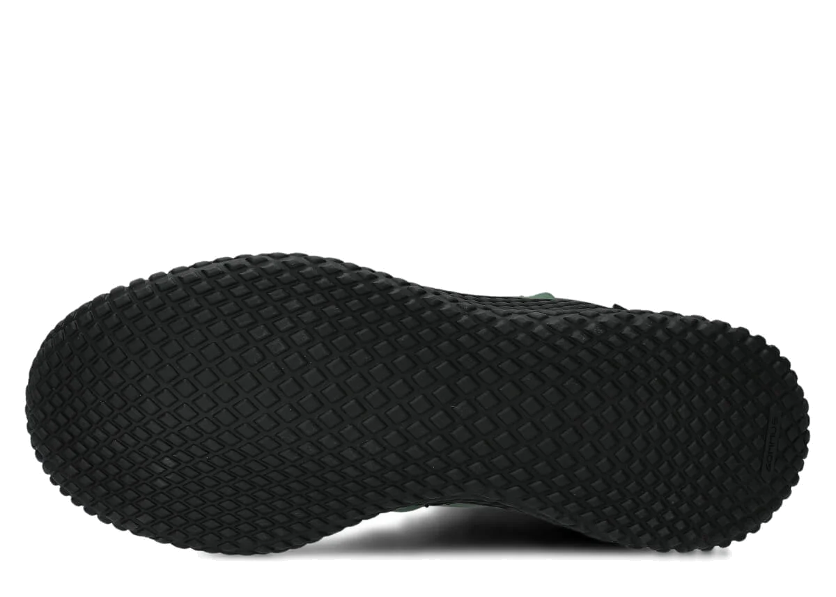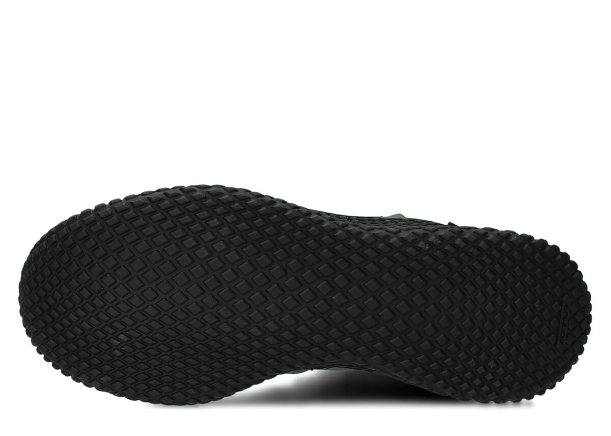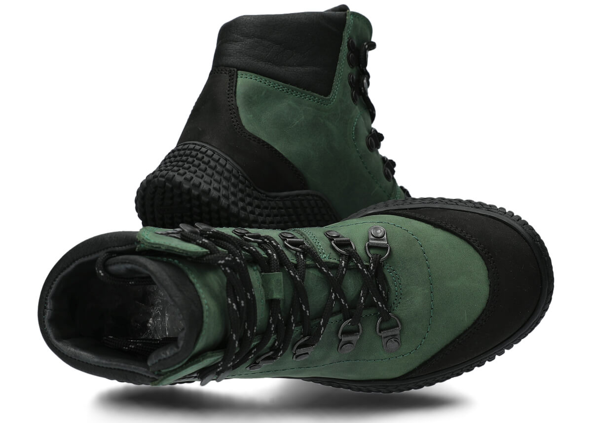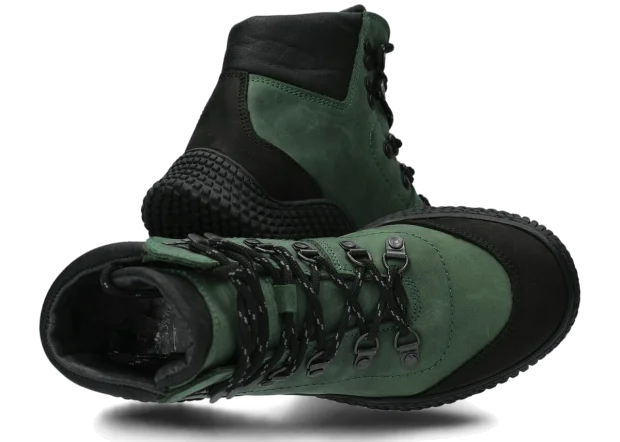 Cholewka składająca się z kombinacji dwóch skór crazy, dominująca zielona skóra naturalna typu crazy w połączeniu z czarnymi wstawkami na nosku, tylniku i kołnierzu tworzy bardzo charakterystyczny, miejsko-outdoorowy wygląd. Gruba, mięsista, olejowana skóra z naturalnymi plamami, przetarciami i zarysowaniami – każda para jest trochę inna, co daje poczucie unikalności.