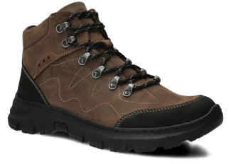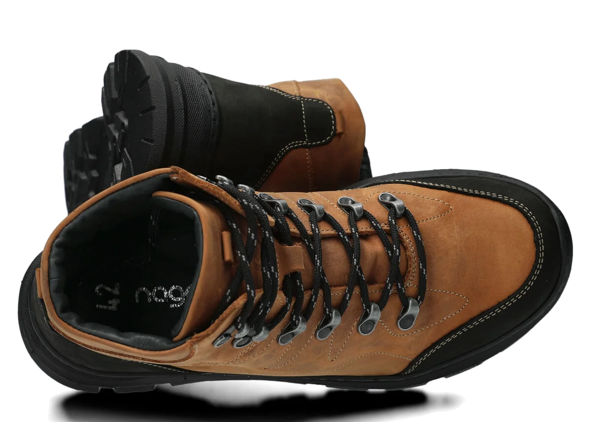 Trzewiki trekkingowe męskie skórzane Nagaba 4091 brąz crazy to mistrzostwo rzemieślniczej pracy – ręcznie wykonane w Polsce z wytrzymałej skóry naturalnej typu crazy. Obuwie za kostkę, z ociepleniem do wyboru (filc lub skóra) i antypoślizgową podeszwą TR-termokauczuk – idealne na jesień, zimę i wiosnę. Dominujący kolor brązowy z czarnymi akcentami na nosku i tylniku, czarne sznurowadła i czarna podeszwa tworzą nowoczesny, outdoorowy look.